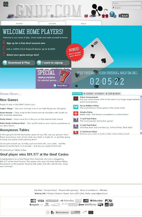 Um site relativamente, mas com boa perspectiva de crescimento, o Gnuf é um site de cassino virtual que apresenta muitas vantagens e tem ganho cada vez mais popularidade, principalmente na Europa. Por utilizar a ferramenta Microgamming, da Prima, o jogo não permite a participação de pessoas dos Estados Unidos, por isso, quando quiser jogar em horários de pico, baseie-se no fuso horário europeu. É site seguro e confiável. Oferece centenas de tipos de jogos, mas o Gnuf tem se destacado pelas mesas de pôquer. Existem inúmeros torneios, e novos surgem todos os dias, com apostas mínimas a partir de dez centavos de dólar. Há mesas com apostas mínimas maiores, mas muitas vezes não há jogadores ousados para isso.